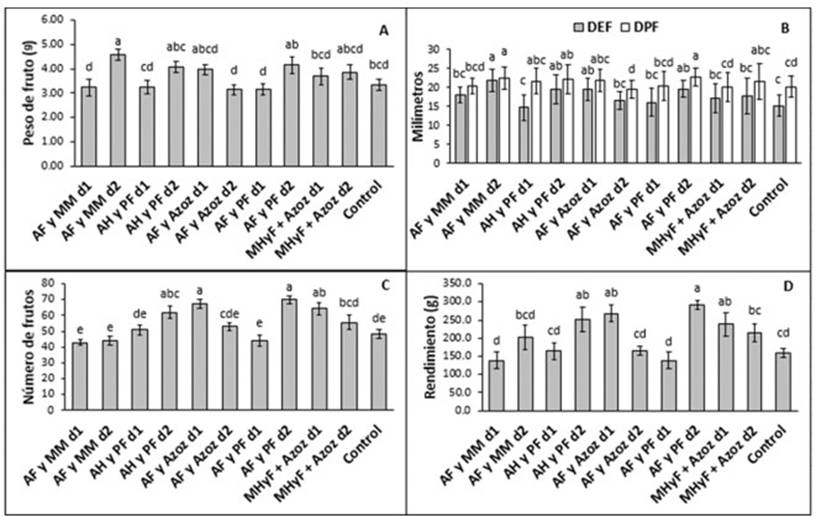 La evaluación del diámetro ecuatorial de fruto (DEF) se observa en la Figura 2B, el crecimiento observado en esta variable es con la aplicación de AFyMM d2, AFyPF d2, AFyAzoz d2 y AHyPF d2 con incrementos respecto al control de 44.5, 29.8, 28.6 y 28.4% respectivamente, los otros tratamientos aplicados se comportaron iguales al testigo. El diámetro polar de fruto (DPF) en la Figura 2B, se favoreció con los tratamientos AFyPF d2, AFyMM d2, AFyAzoz d1, con 13.3, 11.8 y 8.4%, los demás tratamientos estadísticamente fueron iguales al control.