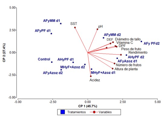 De acuerdo con los vectores propios, en el primer componente principal las variables originales más importantes fueron: peso fruto, altura, número de frutos, rendimiento, las cuales contrastan con SST. En el segundo componente principal las variables con mayor influencia fueron: acidez y altura que contrastan con SST y pH. El tercer componente estuvo fuertemente influido por las variables: peso de fruto y DEF que se relacionan negativamente con diámetro de tallo.