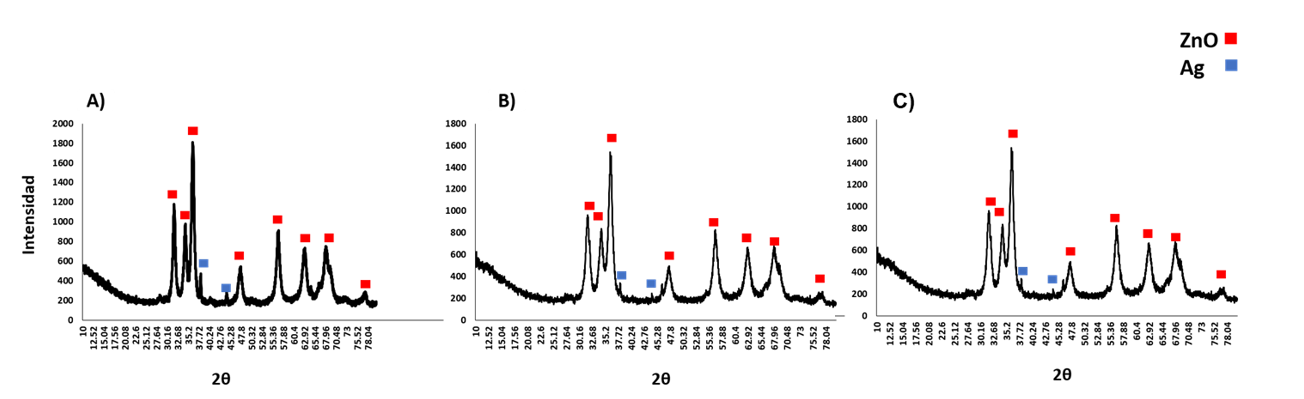 Los resultados muestran la formación de nanocompuestos de ZnO/Ag, debido a que se presentaron picos de difracción correspondientes a dos fases. El principal se indexo como ZnO con estructura hexagonal (JCPD No. 36-1451), mientras que el otro, correspondió a Ag metálica con estructura cúbica centrada en la cara (JCPDS No. 04-0783). Los patrones de difracción confirman la naturaleza cristalina del material compuesto y dado que no se observaron desplazamientos en los picos característicos del ZnO, se infiere que la Ag no sustituye iones Zn²⁺ en la red cristalina del óxido.