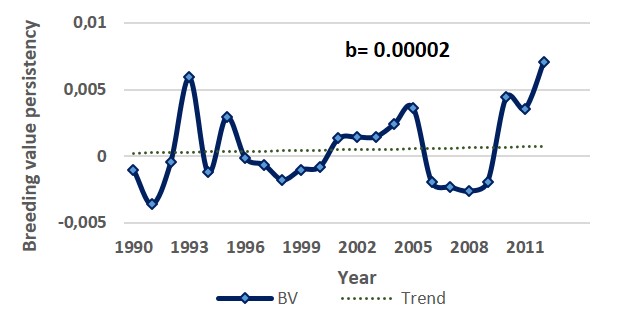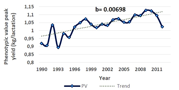 The current MG selection program has been consolidated after 29 yr of selection, emphasizing traits like milk yield, fat, protein, and dry extract yield. In this case, the estimation of genetic trends (TG) is important to evaluate the efficacy of the applied breeding schemes and to provide the breeders with information that will allow them to develop more efficient selection programs5.
