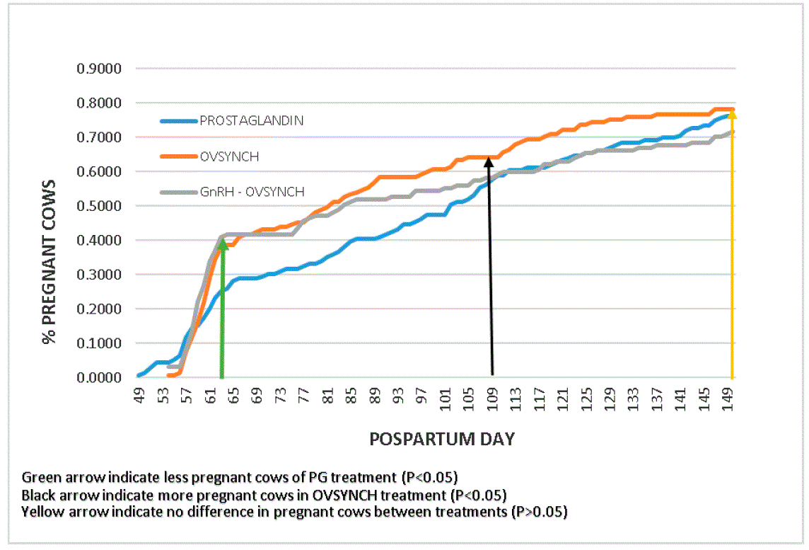 Figure 6 shows the percentage of pregnant cows accumulated in the first 150 d postpartum by effect of the synchronization treatment, in the OVS and ROV treatments from d 62 exhibited a cumulative percentage of pregnant cows (29.2 and 33.8 %) which is higher than that observed in the PG treatment (23.0 %) (P<0.05). This difference increased substantially towards d 65 in the OVS (38.7 %) and ROV (41.7 %) treatments, compared with the PG treatment (28.0 %) (P<0.05); the OVS and ROV treatments maintained this significant difference until the 109th and 145th ds in milk, respectively (P<0.05). After 150 d in milk, the cumulative pregnancy rate was similar for all three treatments (P>0.05).
