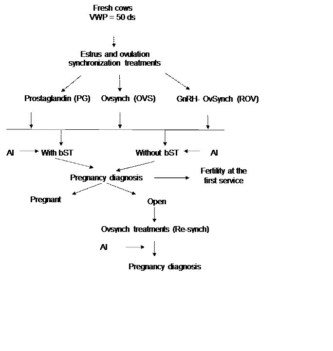 For the evaluation of the fertility of the first postpartum service with similar ds in milk of this service only the cows that presented estrus were inseminated in the PG treatments were considered, and all those with fixed time service (OVS and ROV). The cows of each treatment which exhibited estrus were randomly assigned to two groups: a) bovine somatotropin (C-bST) (n=221); cows received at the time of insemination 500 mg of bovine somatotropin (bST) (Lactotropine, Elanco). B) without bovine somatotropin (S-bST) (n=235). Cows not treated with bST at the time of insemination.