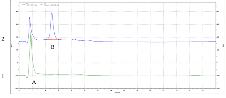 For purification, the bottom of a chromatographic column was filled with glass wool, 5 g of anhydrous sodium sulfate (J.T. Baker) and a sufficient amount of chloroform was added up to the middle of the column. Next, a solution of 10 g of silica gel (J.T. Baker) in chloroform was added by sliding it over the walls of the column. The column walls were washed with 20 ml of chloroform and allowed to drain. When 5 to 7 cm of chloroform remained above the silica, 15 g of anhydrous sodium sulfate were added leaving 1 to 2 cm of chloroform above the top of the sulfate. The chloroform was then drained to the top of the sulfate. The sample was added and drained until it reached the top of the column, which was washed with 150 ml of hexane and 150 ml of diethyl ether. Both washes were discarded and the aflatoxins were eluted with 150 ml of a mixture of chloroform and methanol (97:3 v/v). The chloroform:methanol eluate was rotoevaporated to near dryness under reduced pressure at a temperature of 30 ºC. The residue obtained was transferred to a vial and recovered with 500 to 1000 μl of chloroform and evaporated to dryness under nitrogen. 200 μl of hexane were added to the dry residue and stirred with the vortex (ZX4 Advanced IR Vortex Mixer- VELP Scientifica) for 1 min. Subsequently, 50 μl of trifluoroacetic acid were added, capped and vortexed for 1 min and placed in a double boiler at 40 ºC for 30 min. After this time, they were evaporated under nitrogen. The residue was resuspended in 500 μl of the mobile phase (200 ml methanol, 200 ml acetonitrile, and 600 ml water, filtered and degassed) before being subjected to a chromatography. In order to derivatize the standard, 50 μl of the known concentration of the standard was taken, brought to dryness under nitrogen and proceeded in the same way as described above. A Merck-Hitachi high-performance liquid chromatograph with a LaCrhom-7480 fluorescence detector (excitation and emission length of 350 nm and 450 nm, respectively) and a C18 Lichrocart 100 reverse phase column (5µm 250 x 0.4 cm) were used. The flow rate was 1 ml/min. First, a mobile phase followed by the standard was applied to check the retention times. Subsequently, 50 μl of the eluate from the samples were applied.