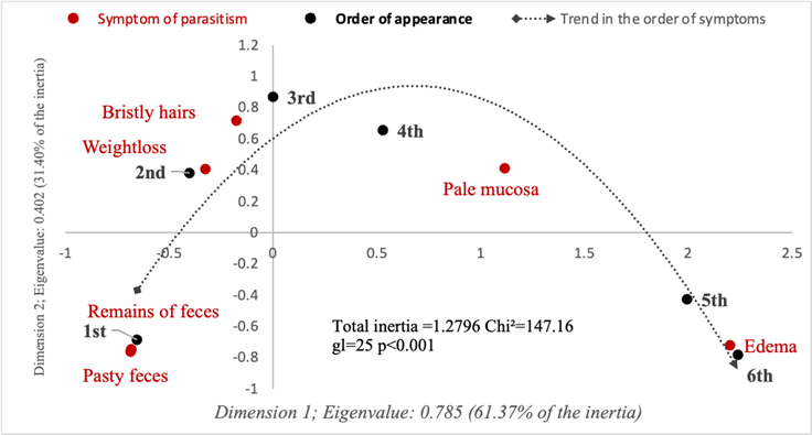 Figure 2 shows that the first signs perceived had to do with changes in feces, followed by clinical manifestations in the general condition of the animals and finally, extreme clinical signs of the development of the anemic syndrome.