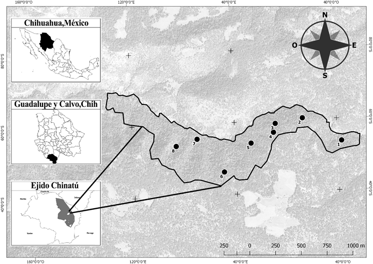 The study was conducted in a mixed forest consisting mainly of Pseudotsuga menziesii, Pinus arizonica Engelm. and Quercus tuberculata Liebm., at the "El Triste" site, which is located in the Chinatú ejido, in Guadalupe y Calvo municipality, at the southwest of the state of Chihuahua, between the coordinates 26°24' N and 106°64' W (Figure 1). It has an area of 80.46 ha and altitudes of 2 530 to 2 830 m. It belongs to the Río Fuerte hydrological region, which in turn corresponds to the physiographic province of Sierra Tarahumara, within the sub-province of Gran Meseta and the Chihuahua Canyons. The predominant soil types in the area are Litosol and, to a lesser extent, Regosol. The climate is classified as sub-humid temperate, and the average annual temperature of the region is 13.7 °C, with an average annual rainfall of 1 126.8 mm (Chávez, 2009).