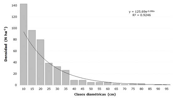 The diameter distribution of the forest showed a negative exponential trend in the form of a Liocourt curve or "inverted J" (Figure 2), which reveals a community in the process of regeneration, with development towards greater stages of growth. The mature plant community, made up of trees, probably in a long-lived phase and belonging to the upper diameter classes, will be replaced by a large number of young individuals (Arruda et al., 2011; Hernández-Stefanoni et al., 2011).