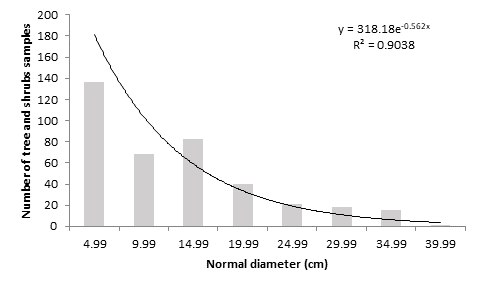 Figure 1 shows the graph of diameter classes. The curve describes a negative exponential trend, as the number of individuals decreases as the normal diameter increases. This revealed that a high number of individuals with small diameters and a low number of individuals with high diameters prevail. In total, 136 individuals with a normal diameter less than 5 cm and 34 >30 cm were counted.