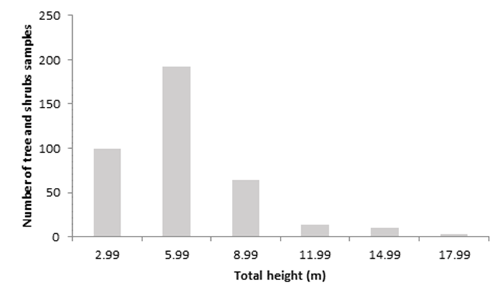 Figure 2 illustrates height classes, in which it is noted that the greatest presence of trees was recorded in the 3 to 5.99 m category with 192 individuals, followed by the ≤2.99 m category with 100 samples. There are few individuals with a height greater than 12 m. The distribution of the specimens with respect to their height category represented a positive asymmetric distribution.