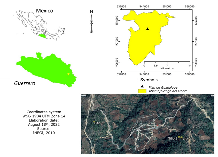 Plan de Guadalupe belongs to the La Montaña region; It is located at 2 050 masl, between 17°10' and 17°21' N, 98°30' and 98°39' W; it is bordered to the north by Malinaltepec, Copanatoyac and Xalpatláhuac municipalities, to the east by Xalpatláhuac and Metlatónoc, to the south by Metlatónoc and Malinaltepec, and to the west by Malinaltepec and Copanatoyac (Inegi, 2022) (Figure 1).