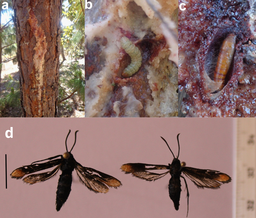 a) Resin on the stem b) larvae, c) pupa and d) adult. The scale bar for d) equals 1 cm.