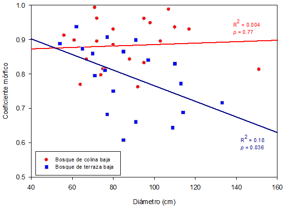 El ANCOVA mostró que el CM varía significativamente entre los dos tipos de bosque, el cual explica 22 % de la variabilidad del CM (p<0.001, Cuadro 3). El DAP no influyó en el CM (p>0.05), aunque sí la interacción entre Bosque×Diámetro (p=0.046). Esto sugiere que la relación entre el diámetro y el CM varía según el tipo de bosque, la que es directa y no significativa en el bosque de colina baja e inversa y significativa en el de terraza baja (Cuadro 3, Figura 2). El modelo de regresión ajustado expresado como CM=0.993-0.00227×DAP solo fue significativo para el bosque de terraza baja (R 2 =0.18 y p<0.05).