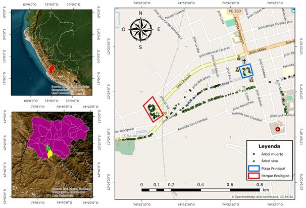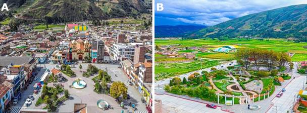 El área de estudio se encuentra entre las coordenadas geográficas (WGS 84 zona 18 sur) del centro del distrito de 12°23′56” S y 74°52′00” O, a 3 372 m de altitud; clima moderado lluvioso y templado, con un invierno seco templado en el día y gélido en la noche, cuya temperatura varía entre 12 y 14 °C, descendiendo hasta -2 °C (Servicio Nacional de Meteorología e Hidrología del Perú [Senamhi], 2022) (Figura 1). La investigación se efectuó en dos espacios abiertos urbanos (Parque Ecológico y Plaza Principal) de la ciudad de Pampas, provincia Tayacaja, región Huancavelica, sierra del Perú (Figura 2). El Parque Ecológico tiene 1 500 m2 de área y la Plaza Principal 965 m2.