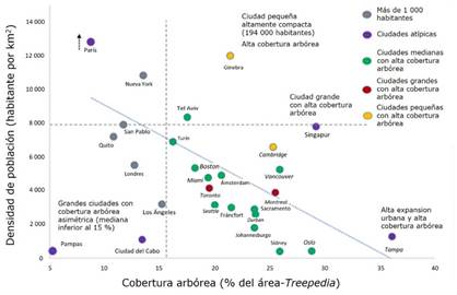 En la Figura 4 se muestra la relación de los datos de 27 ciudades a nivel mundial, de lo cual se concluyó que al disminuir la densidad de población se incrementa la cobertura arbórea.