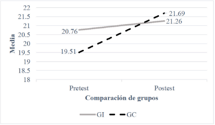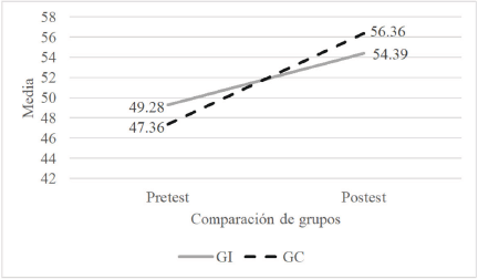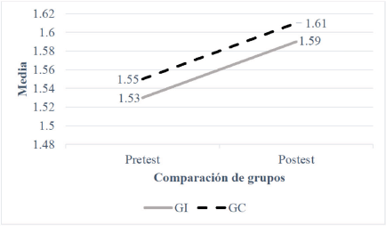 En la figura 3, se observa que la media de IMC en el grupo control incrementó, en mayor medida, comparada con el grupo intervenido, del pretest al postest. Cabe señalar que en el grupo control dicho cambio mostró significancia estadística, por el contrario, en el grupo intervenido el ligero cambio no es significativo.
