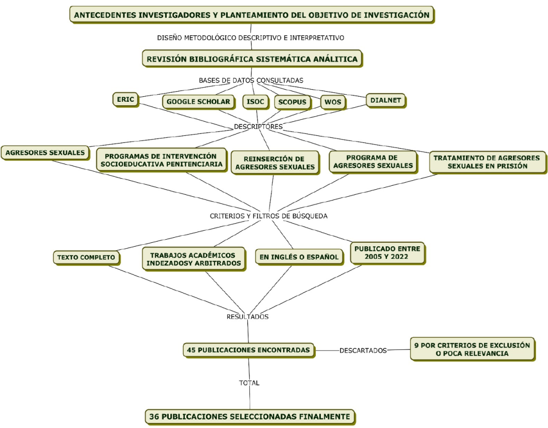 Para la recogida de información, en la búsqueda se usaron los siguientes descriptores: a) agresores sexuales, b) programas de intervención socioeducativa penitenciaria, c) programas de agresores sexuales, d) tratamientos para agresores sexuales en prisión, y e) reinserción de agresores sexuales.
