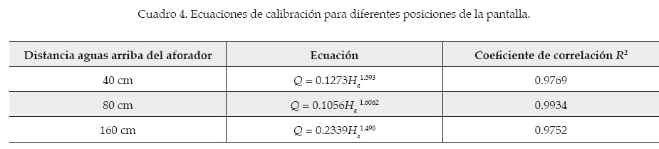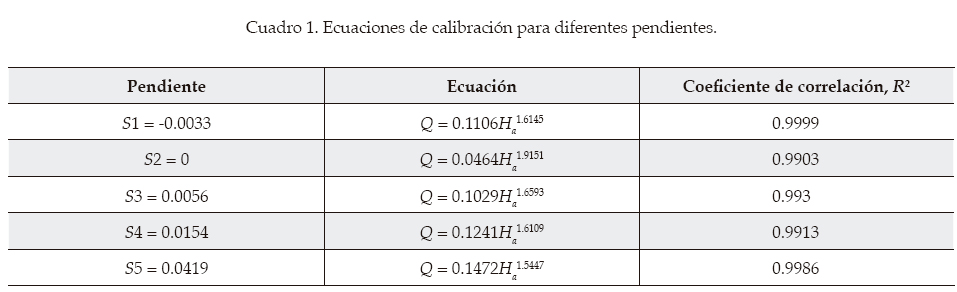 Acorde con el objetivo de la investigación, se determinaron ecuaciones de calibración, pero se cambió un poco el enfoque: al no lograr valores altos del número de Froude, se buscaron diferentes calibraciones para cada valor de la pendiente. Las ecuaciones resultantes se presentan en el cuadro 1. En primer lugar, es notorio que para cada pendiente se tiene una diferente ecuación, como se aprecia en los valores del coeficiente y del exponente.