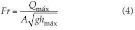 Donde Fr es el número de Froude, adimensional; Qmáx es el gasto máximo que puede circular por el aforador en m3/s; A es el área hidráulica en m2; g es la aceleración de la gravedad, en m/s2, y hmáx es el tirante máximo correspondiente a Qmáx. La norma no indica en dónde debe medirse el tirante hmáx, por lo que decidió medirse justo antes de la entrada del aforador.