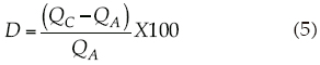 Con objeto de presentar de manera gráfica las diferencias entre las ecuaciones, se calculó la diferencia porcentual entre el gasto resultante de la ecuación ASTM y los gastos calculados con las ecuaciones de calibración. La diferencia se calculó con la ecuación (5), donde QC es el gasto de calibración en l/s y QA es el gasto de la ecuación ASTM, también en l/s. De esta manera, si el resultado es positivo significa que la ecuación calibrada sobrestima el gasto y viceversa: