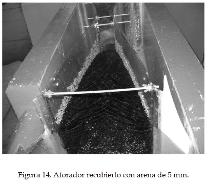 Para realizar estas pruebas se cubrieron las paredes y el fondo del aforador con dos diferentes tamaños de arena. En las normas se recomienda construir el aforador con un acabado de cemento pulido y el tamaño máximo de la rugosidad no debe ser mayor de 0.4 mm; como tal tamaño es poco práctico, se usó arbitrariamente arena de aproximadamente 2 y 5 mm (figuras 13 y 14); también se consideró el caso del aforador sin recubrimiento como una tercera opción prácticamente lisa.