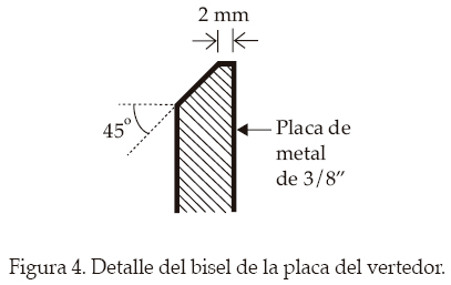 Para dar mayor confiabilidad al vertedor se cumplieron los requisitos que propone Sotelo en el mismo libro citado; dichos requisitos son los siguientes: a) vertedor perfectamente horizontal; b) bisel de 2 mm; c) altura del vertedor mayor a 30 cm y también mayor a dos veces la carga; d) vertedor perpendicular al eje del canal; e) canal recto y con una longitud mayor a diez veces el ancho del vertedor (el canal tiene 15.67 m y el vertedor tiene 0.6 m de ancho); f) área del canal de al menos 8bh, donde b es el ancho del canal y h es la carga sobre el vertedor; g) el punto de lectura de la carga está a más de cuatro veces la carga máxima sobre el vertedor, y h) se tiene eficiente ventilación de la superficie inferior de la lámina vertiente.