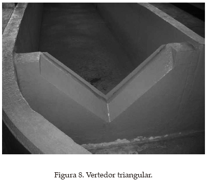 Para el control de las pruebas realizadas en el canal de flujo permanente se utilizó como medidor de referencia un vertedor triangular de pared delgada, mismo que también se calibró volumétricamente. Esta calibración se realizó colocando un tanque aguas abajo del vertedor; dicho tanque se "cubicó" utilizando una probeta de dos litros, misma que se llenaba de agua y se vaciaba en el tanque, marcando la altura que alcanzaba el nivel para cada cinco probetas. Inmediatamente después del vertedor se colocó un canal portátil, mismo que se usaba para evitar el llenado del tanque mientras el gasto variaba; una vez que el gasto se estabilizaba, se retiraba súbitamente el canal portátil y se contabilizaba el tiempo de llenado del tanque; de esta manera se obtuvo el gasto. La ecuación resultante de esta calibración fue la ecuación (2):