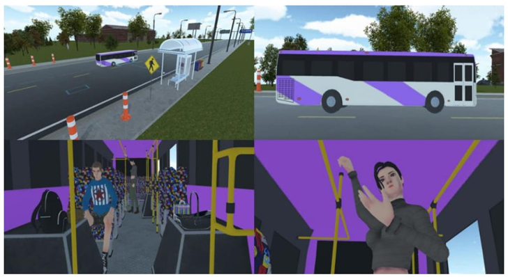El escenario virtual consiste en la parada de transporte, donde al llegar el autobús el usuario debe abordar. Al ser en primera persona, el usuario solo ve las manos del personaje que encarna. Al entrar al autobús se visualiza que solo hay dos personajes adicionales, uno del sexo masculino sentado en los primeros asientos y una del sexo femenino parada en el fondo. El usuario tiene libertad de movimiento y puede interactuar con los objetos que se encuentran allí.
