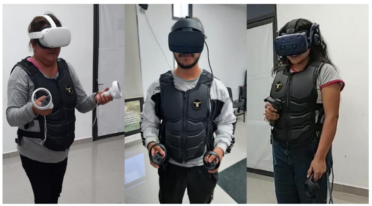 Posterior a la entrega de la encuesta, los participantes procedieron a colocarse el equipo de realidad virtual y los sensores hápticos. Se usaron dos visores de realidad virtual: un Oculus Quest 2 y un HTC Vive Pro; el chaleco háptico es un Tactsuit X40 de bHaptics. En el mismo instante también se les explicó a los participantes las situaciones que pasan cierto grupo de personas, principalmente mujeres, en el transporte público al ser acosadas de forma física y verbal, siendo acciones que ellos pasarían en el simulador de realidad virtual al momento de abordar un autobús. Esto con la intensión de que imaginaran como sería el suceso para, a continuación, poner en funcionamiento el simulador como se muestra en la Figura 2.