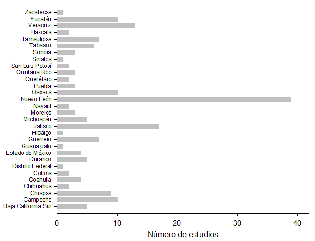El ecosistema con mayor concentración de estudios es la selva baja caducifolia (Anexo 1). Una de las razones posibles por las que este ecosistema despierta el interés de los investigadores es quizá su alta diversidad de especies (Bullock & Solis-Magallanes, 1990). La mayor parte de trabajos de análisis de la selva baja caducifolia se ha realizado en Jalisco (11 estudios), conducidos usualmente por la Universidad Nacional Autónoma de México en la Estación Biológica Chamela, aunque dicho ecosistema también se ha estudiado en otros estados del país. Esto permite inferir que, coincidentemente, los estudios se han distribuido espacialmente en función de su proximidad al área de influencia de las instituciones de investigación. Por ejemplo, Nuevo León es la entidad con mayor número de estudios, realizados en su mayoría por investigadores de la Universidad Autónoma de Nuevo León, principalmente en el Parque Ecológico Chipinque y en el matorral espinoso tamaulipeco.