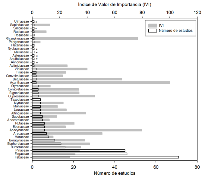 La Figura 3 reporta las familias botánicas y su índice de valor de importancia a partir de los trabajos encontrados. Las familias referidas con mayor frecuencia fueron Fabaceae, Fagaceae y Pinaceae; en contraste, las reportadas sólo en un estudio fueron: Actinidiaceae, Annonaceae, Asteraceae, Cupressaseae, Melinaceae, Nyctagynaceae, Platanaceae, Polygonaceae, Rhizophoraceae, Rosaseae, Rubiaceae, Salicaceae y Sapindaceae. Las familias reportadas con mayor valor en el índice de importancia ecológica (> 70) fueron Acanthaceae (Avicennia germinans [L.] Stearn), Rhizophoraceae (Rhizophora mangle L.), pertenecientes a los ecosistemas de manglar, y Apocynaceae con el género Tabernaemontana en la selva baja perennifolia. Las familias con mayor número de estudios (Fagaceae, Fabaceae y Pinaceae) fueron reportadas con valores de importancia promedio de 27 a 34.