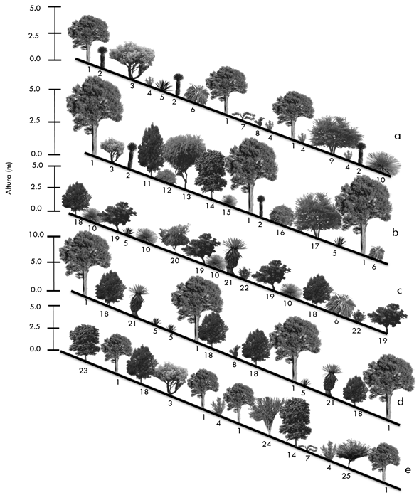 La estructura vertical y horizontal de la vegetación en cada comunidad se representó por medio de diagramas de perfil semirrealista (Richards, Walsh, Baillie, & Greig-Smith, 1996), elaborados con base en la DR, DER, FR, altura promedio de las especies y observaciones en campo sobre la fisonomía de la vegetación de las localidades. Se realizó un perfil por comunidad con base en la variante fisionómica más extendida.
