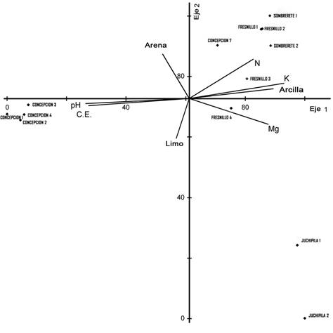 El análisis de agrupamiento se utilizó para clasificar las comunidades vegetales en categorías o grupos, a partir de la composición florística de cada comunidad. La agrupación fue jerárquica, politética y aglomerativa, utilizando el promedio entre grupos como método de unión, y el índice de Sørensen como medida de semejanza (Rocha, Chavez, Ramírez, & Cházaro, 2012). Para definir los grupos formados en el análisis de agrupamiento, se eligió un nivel de corte estándar en el que se consideró 50 % de la información remanente (McCune & Grace, 2002). La influencia de los factores edáficos (pH, CE, MO, N, P, K, Ca y Mg) en la composición florística de las comunidades se determinó con un análisis de correspondencia canónica. Ambos análisis se realizaron con el programa de cálculo PC-ORD versión 6 (McCune & Mefford, 2011).