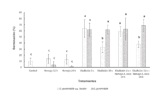 La germinación de O. pyramidale en su variedad típica (62 a 69 %) fue estadísticamente mayor (P = 0.05) con los tratamientos que incluyeron inmersión de las semillas en agua en ebullición. En el caso de O. pyramidale var. bicolor, los valores más altos de germinación corresponden a los tratamientos Ebullición3s (64 %) y Ebullición3s + Remojo24h (59 %). Las semillas de O. pyramidale var. bicolor fueron susceptibles al tiempo de inmersión de agua en ebullición, ya que la germinación fue estadísticamente mayor (P = 0.05) a los 3 s que a los 10 s.