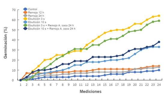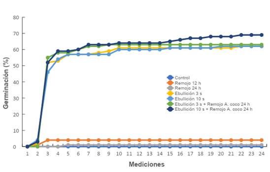 Se evaluaron siete tratamientos germinativos: testigo (control), remojo en agua a temperatura ambiente (Remojo12h y Remojo24h), inmersión en agua en ebullición a 100 °C (Ebullición3s y Ebullición10s) e inmersión en agua en ebullición y remojo en agua de coco (Ebullición3s + Remojo24h, y Ebullición10s + Remojo24h). El agua de coco se utilizó como fuente natural de citocininas.