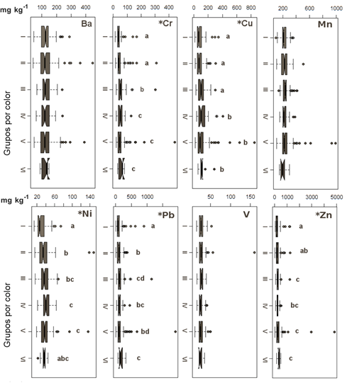 Las muestras de polvo urbano se clasificaron en marrón grisáceo obscuro (I), gris obscuro (II), marrón oliva obscuro (III), gris muy obscuro (IV), marrón grisáceo (V) y negro (VI). Las regresiones lineales múltiples entre los índices de color y los MP mostraron correlación alta y significativa (P < 0.05) en los grupos I, II, III y IV. Los MP del polvo urbano se encontraron de manera general en el orden Zn > Mn > Ba > Pb > Cu > Cr > Ni > V. El Cr, Cu, Ni, Pb y Zn presentaron diferencias significativas (P < 0.05) entre los grupos de color; las muestras de color gris muy obscuro a negro fueron las más contaminadas, y las de color marrón grisáceo obscuro tuvieron contenidos menores de MP.