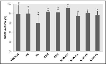 Figura 4 Supervivencia de las plantas de Pinus engelmannii en los tratamientos con inoculantes micorrícicos comerciales y fertilizante de liberación controlada, después de ocho meses de la siembra. FB = fertilización baja (3 g·L-1), FA = fertilización alta (6 g·L-1), ICHN = inoculante comercial con esporas de hongos nativos (1 mL·planta-1 [1.05 x 107 esporas·mL-1]), ICHE = inoculante comercial con esporas de hongos exóticos (1.5 mL·planta-1 [6.5 x 106 esporas·mL-1]).