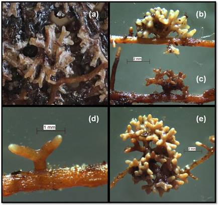 Figura 6 Morfotipos de ectomicorrizas en Pinus engelmannii: (a) morfotipo afín a Amanita spp.; (b) morfotipo afín a Scleroderma citrinum; (c) morfotipo afín a cepa comercial de Pisolithus tinctorius descrita por Valdés et al. (2010); (d) ectomicorriza en desarrollo inicial; (e) ectomicorriza afín a Scleroderma citrinum en estadio maduro.