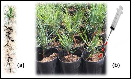 Previo a la inoculación, las concentraciones de esporas en cada inoculante se verificaron con la cámara Neubauer o hematocitómetro para fijar las dosis empleadas en cada tratamiento propuesto. Los inoculantes con esporas de hongos nativos y exóticos tuvieron una concentración de 1.05 x 107 esporas·mL-1 y 6.5 x 106 esporas·mL-1, respectivamente. La inoculación se realizó cuatro meses después de la siembra cuando las plántulas presentaron raíces secundarias (Figura 1a). El procedimiento consistió en inyectar la solución de esporas directamente en el sustrato de cultivo, aproximadamente en un ángulo de 45° con respecto a la raíz principal de la planta a una profundidad de 5 cm, procurando que la solución tuviera el mayor contacto posible con el sistema radical (Figura 1b).