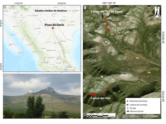 El estudio de la reconstrucción de eventos geomorfológicos con base en los crecimientos anuales de P. ponderosa se realizó en la montaña Los Picos de Davis al noreste de Múzquiz, al centro-norte del estado de Coahuila de Zaragoza, México (Instituto Nacional de Estadística y Geografía [INEGI], 2009) (Figura 1a). Los sitios de estudio cañón del Oso (OSO) y cañón Ojo de Agua (OJO) se localizan entre las coordenadas 28° 58' 12.45" (28.9701°) N y -102° 01' 27.99" (-102.0244°) W (Figura 1b).