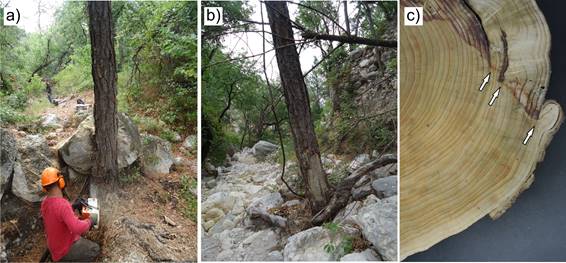 Figura 2 a) Árbol con indicio macroscópico y con potencial para detectar eventos de avenidas torrenciales en el centro del cañón del Oso en la montaña Los Picos de Davis; b) árbol con disturbio dendrogeomorfológico: descortezado por impacto de carga sólida de la corriente; y c) cuña preparada para su análisis con evidencia de cicatrices por impacto de roca (flechas).
