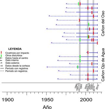 Los anillos de crecimiento de las 19 muestras analizadas tuvieron 25 disturbios ocasionados por el paso de avenidas torrenciales. En general, el cañón del OSO tuvo más disturbios (68 %) que el cañón del OJO (32 %). El disturbio más común fue en forma de cicatriz por impacto directo en el árbol con 72 % del total, dividido en 52 % y 20 % para el cañón del OSO y cañón del OJO, respectivamente. El segundo disturbio más común (20 %) fue la supresión en el crecimiento de los anillos, registrando 8 % en el cañón del OSO y 12 % en el cañón del OJO. Por último, 8 % de las muestras registraron anillos excéntricos y madera de compresión; estos tipos de disturbio solo se observaron en el cañón del OSO (Cuadro 1).