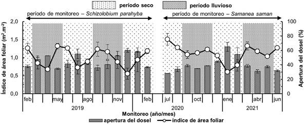 Figura 4 Valores mensuales del índice de área foliar y apertura del dosel durante el periodo de monitoreo anual en Schizolobium parahyba y Samanea saman en Rionegro, Santander, Colombia. Las barras de variación representan el error estándar de la media (n = 2).