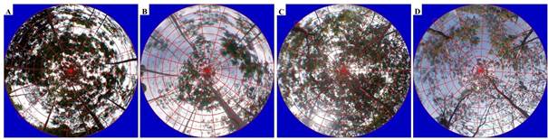 Figura 5 Procesamiento de fotografías hemisféricas mediante el sofware GLA 2.0 para el monitoreo anual de la estructura del dosel en Schizolobium parahyba (índice de área foliar máximo en mayo 2020 [A] y mínimo en febrero 2021 [B]) y Samanea saman (índice de área foliar máximo en julio 2020 [C] y mínimo en enero 2021 [D]) en Rionegro, Santander, Colombia.