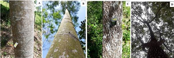 Figura 6 Ilustración de textura de la corteza, rectitud del fuste e inicio de la ramificación en Schizolobium parahyba (A y B) y Samanea saman (C y D) en Rionegro, Santander, Colombia.