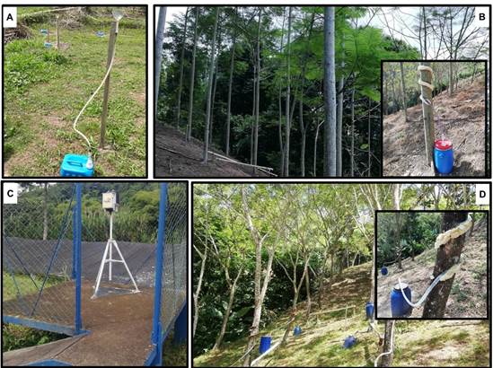 El escurrimiento fustal se cuantificó en tres (S. parahyba) y cinco (S. saman) árboles similares al valor DAP medio de la parcela. En el árbol seleccionado se instaló una manguera plástica de 1 in (2.54 cm) a 1.3 m encima del suelo en espiral, cortada longitudinalmente y sellada con silicona, completando al menos una vuelta al fuste (Figura 1B y 1D). El agua escurrida por el fuste se drenó por la manguera y se almacenó en colectores de 15 L. Los volúmenes de escurrimiento por el fuste (L) se dividieron por el área de copa (m2) proyectada de cada árbol, calculada a partir de ocho radios de copa direccionales (Tonello et al., 2014). Debido a las restricciones de desplazamiento al sitio experimental, la precipitación interna y el escurrimiento fustal se cuantificaron simultáneamente con periodicidad semanal, para así obtener el acumulado mensual; es decir, una colecta en campo pudo incluir uno o varios eventos de lluvia.