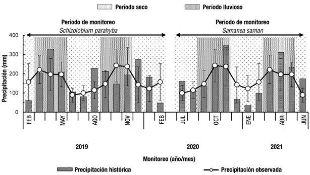 Figura 2 Valores mensuales de la precipitación histórica (1983-2018) y observada (2019-2021) durante el periodo de monitoreo anual de Schizolobium parahyba y Samanea saman en Rionegro, Santander, Colombia. Las barras de variación representan la desviación estándar de la precipitación histórica.