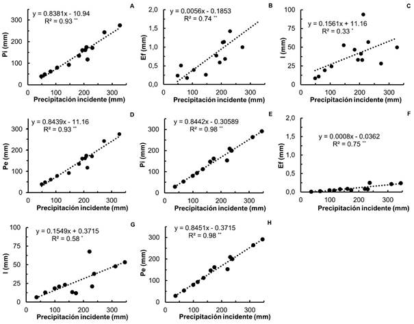 Figura 3 Regresión lineal entre la precipitación incidente y la precipitación interna (Pi), escurrimiento fustal (Ef), pérdidas por interceptación (I) y precipitación efectiva (Pe) en Schizolobium parahyba (A, B, C y D) y y Samanea saman (E, F, G y H) en Rionegro, Santander, Colombia. Significancia estadística: *P < 0.05 y **P < 0.01.