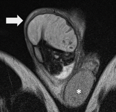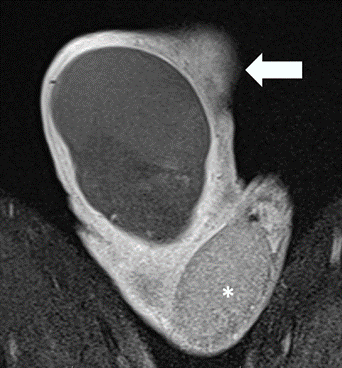 TD ascendido, horizontalizado, con moderado aumento de tamaño y señal heterogénea predominantemente hipointensa (flecha) comparar con testículo contralateral de características conservadas (*). Origen: Servicio de Diagnóstico por Imágenes. Hospital Italiano de Buenos Aires. Buenos Aires, Argentina. 2021.