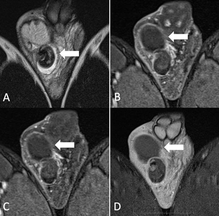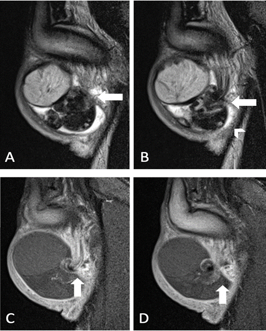 A) Imagen sagital secuencia T2. Cambio de calibre del cordón espermático (flecha). B) Imagen sagital secuencia T2. Signo de whirlpool (flecha) y presencia de hidrocele (cabeza de flecha). C) Imagen sagital secuencia T1. Ausencia de captación de contraste en TD, epidídimo y sector proximal del cordón espermático derechos (flecha). D) Imagen sagital secuencia T1. Continuación de la rotación del cordón espermático derecho (flecha). Origen: Servicio de Diagnóstico por Imágenes. Hospital Italiano de Buenos Aires. Buenos Aires, Argentina. 2021.