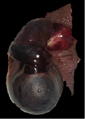 Expone testículo derecho cianótico con cambios hemorrágicos en el cordón espermático a través del sitio de incisión escrotal (*). Origen: Servicio de Diagnóstico por Imágenes. Hospital Italiano de Buenos Aires. Buenos Aires, Argentina. 2021.