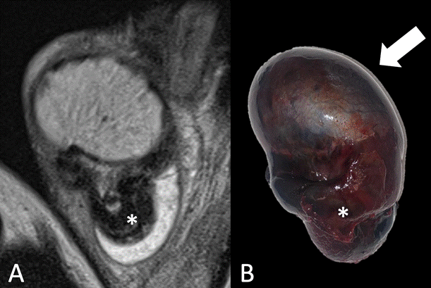 A) Imagen coronal secuencia T2 que muestra la torsión a nivel del cordón espermático (*). B) Pieza quirúrgica con vista frontal. Se observa el TD aumentado de tamaño con focos de necrosis a expensas del edema periférico (Flecha). Origen: Servicio de Diagnóstico por Imágenes. Hospital Italiano de Buenos Aires. Buenos Aires, Argentina. 2021.